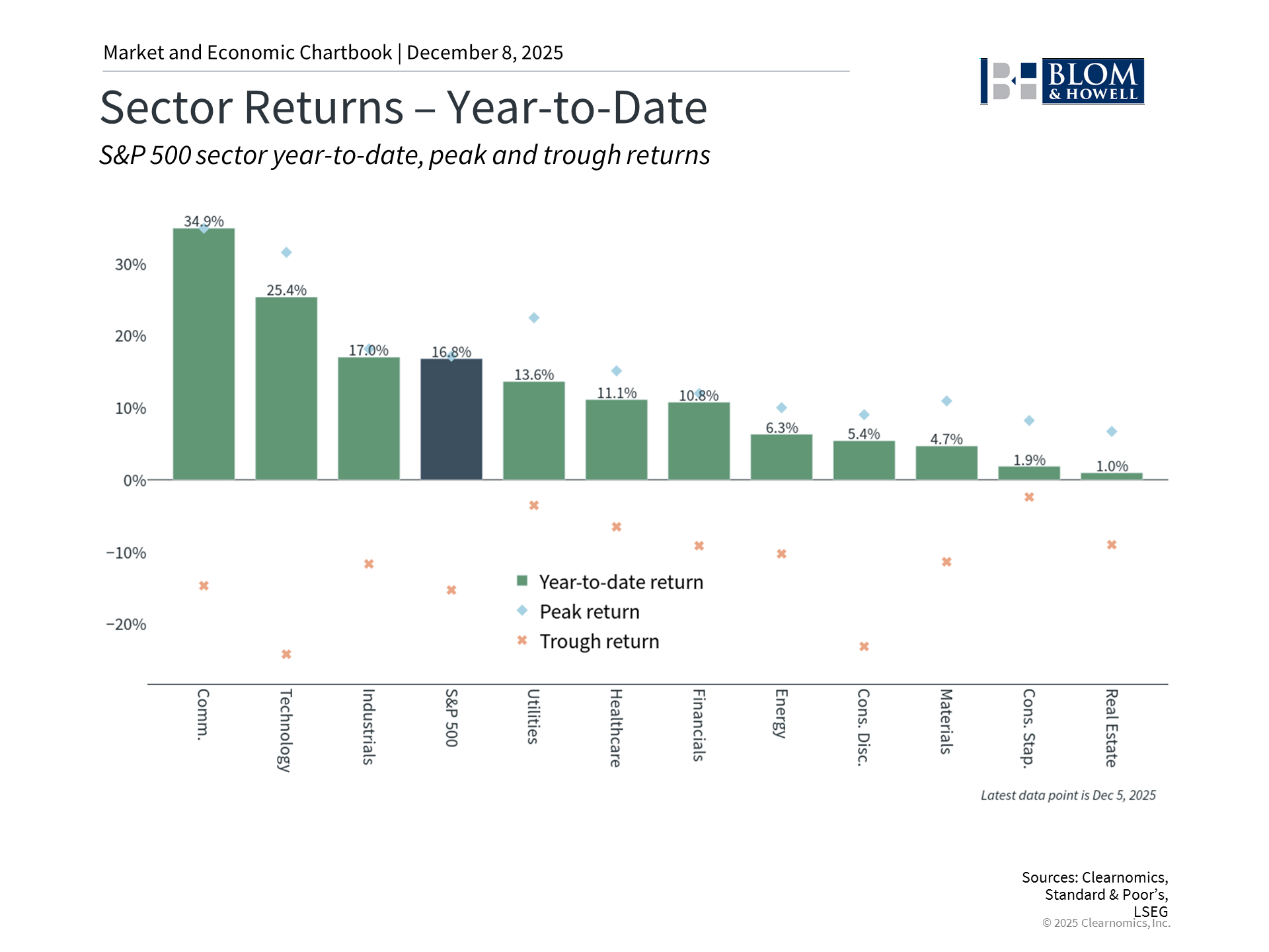 One effect of the strong returns of the past several years is that stock market valuations continue to rise. The S&P 500 currently trades at a price-to-earnings ratio of 22.5x, approaching the all-time high of 24.5x reached during the dot-com bubble. By definition, this means that investors are paying more for each dollar of future earnings than in recent years. Investors typically worry about valuations when they become disconnected from the underlying fundamentals. For example, the dot-com bubble experienced historic valuation levels that far outpaced revenues and earnings, as investors rewarded any company related to the “new economy.” While valuations are expensive today due to enthusiasm around AI and ongoing economic growth, corporate fundamentals remain strong. Earnings have grown at a healthy pace, with the expectation they could continue to do so according to consensus estimates data by LSEG. So, it’s important to recognize what high valuations do and do not tell us. Valuations don't necessarily predict immediate market declines since markets can remain expensive for extended periods. While some investors worry about an “AI bubble,” the reality is that not all bubbles pop. Instead, some deflate slowly as the fundamentals catch up. This is one difference between the dot-com bust of the late 1990s and early 2000s and the growth of cloud computing over the past decade. However, high valuations do suggest that returns could be more modest going forward, since markets are already accounting for future growth. This can also increase the market’s sensitivity to disappointments. Investors often say that markets like these are “priced for perfection,” so even minor misses on earnings or economic data can spur volatility. This means that being selective and maintaining balance across different parts of the market - including asset classes, sectors, sizes, styles, and more - will only grow in importance. 3. AI is driving economic growth and returns