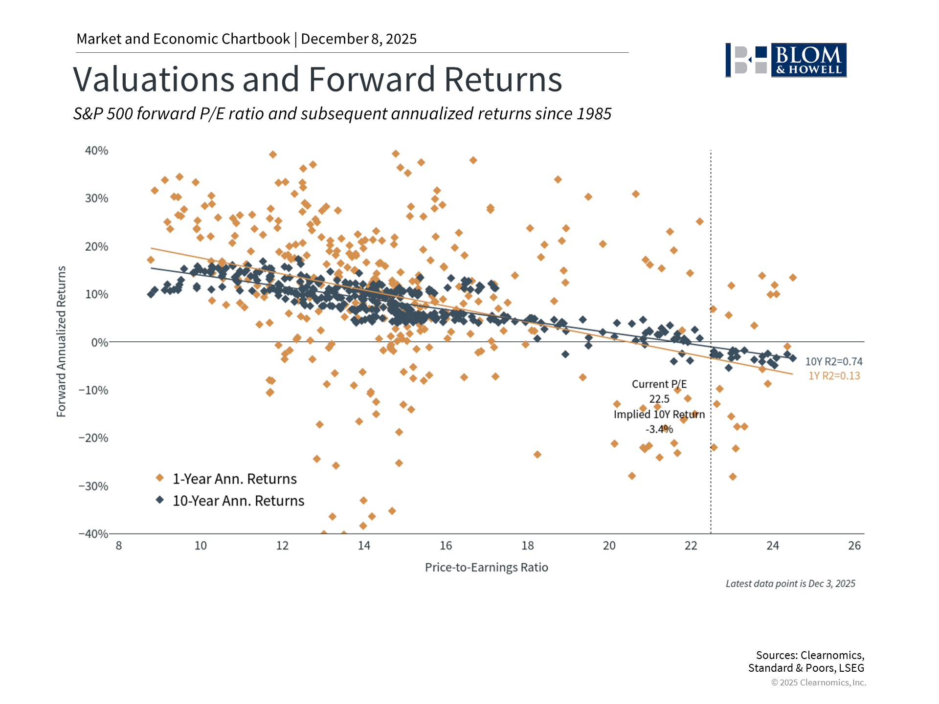 Importantly for investors, many asset classes are contributing to portfolio returns as we near 2026. This is in contrast to much of the past decade when U.S. stocks outperformed the rest of the world. In 2025, international stocks are outpacing U.S. markets, with developed market stocks (MSCI EAFE) and emerging market stocks (MSCI EM) each gaining around 30% in U.S. dollar terms. This has been driven by two key factors: improving growth expectations in many economies and the weakening dollar, which boosts returns for U.S.-based investors. Fixed income is also playing an important stabilizing role in portfolios. The Bloomberg U.S. Aggregate Bond Index has gained 7% for the year as the Federal Reserve continues cutting interest rates and inflation stabilizes. Higher-quality bonds have been serving their purpose by providing income and offsetting stock market volatility during periods of market uncertainty. In the coming year, this underscores the importance of balance and diversification. While it may be tempting to make sudden portfolio changes based on headlines, investors who stay on track with their financial plans are likely to be rewarded. 2. Market valuations are approaching dot-com levels