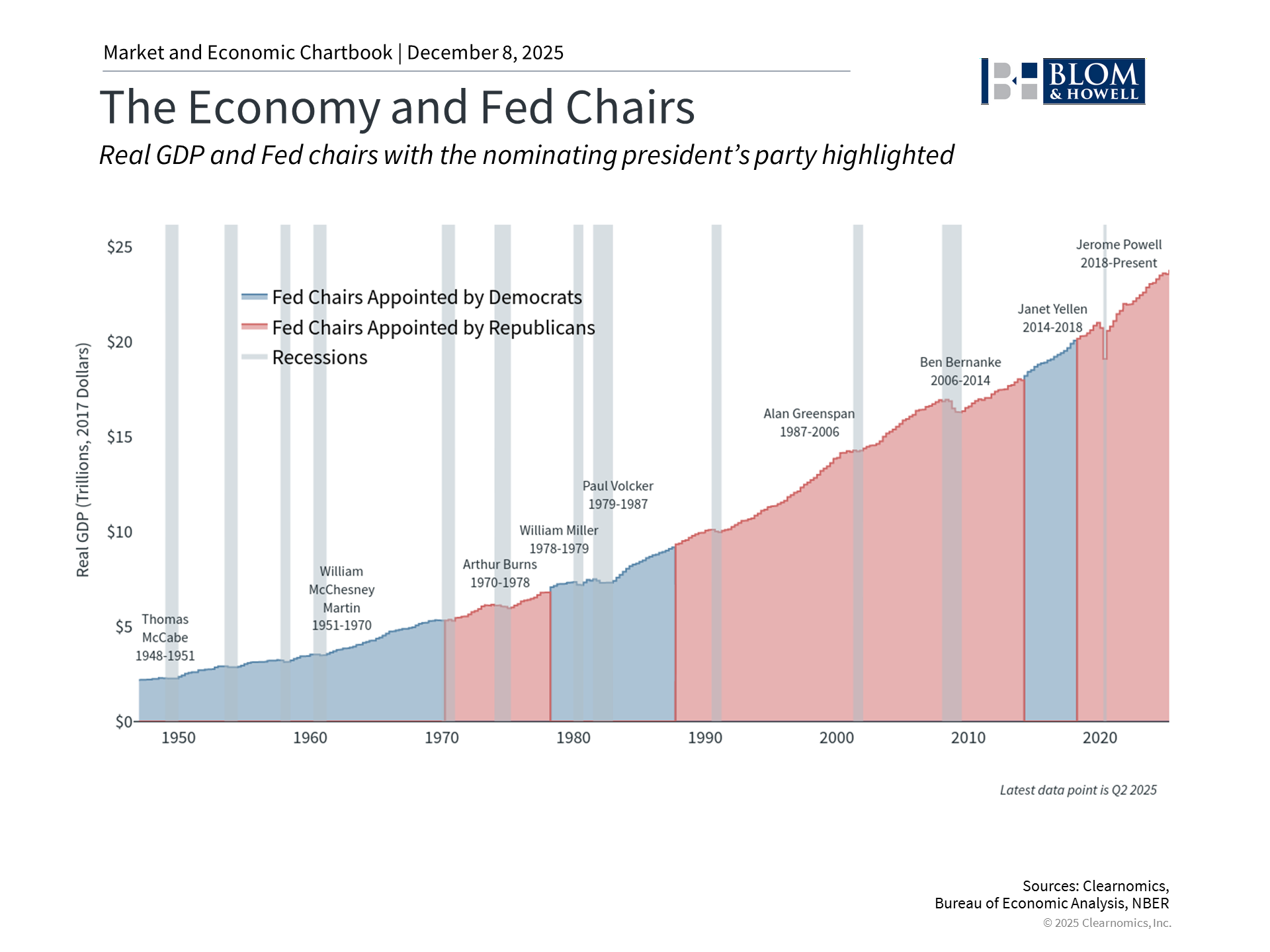 The Fed resumed cutting rates in September after pausing earlier in the year. As we enter 2026, the path of monetary policy could become less certain. This is because the risk of runaway inflation may no longer be the primary concern as a weaker job market has grown in importance. This requires tweaks to policy rates rather than dramatic shifts, such as those seen in 2022. An additional complication is that Fed Chair Jerome Powell's term will end on May 15, 2026, paving the way for new leadership at the Fed. The White House is expected to appoint a successor who may favor additional rate cuts to support the administration's economic agenda of lower interest rates. The chart above shows that the economy has performed well across Fed Chairs appointed by both parties. It’s important to note that the Fed only controls the “short end” of the yield curve, that is, interest rates that are closely tied to the federal funds rate. Long-term interest rates depend on many other factors, such as economic growth, inflation, and productivity. So, rather than follow the Fed’s every move and parse every statement, investors should continue to focus on these longer-term trends to understand the impact on interest rates and bonds. Maintaining perspective in 2026 As we enter 2026, investors face a familiar challenge: balancing concerns with the reality that markets have consistently rewarded patient, disciplined investors over time. The list of worries is ever-present, yet history suggests that for every crisis that disrupts markets, many more feared events have failed to materialize. What separates successful long-term investors isn't the ability to predict which concerns matter most, but the ability to stay balanced throughout all phases of the market cycle. The bottom line? Markets have delivered strong returns, but elevated valuations and slower global growth suggest more modest expectations for 2026. Rather than attempting to time the market based on any single concern, investors should focus on maintaining balanced portfolios positioned for various outcomes. References 1. https://www.census.gov/hfp/btos/data_downloads 2. https://www.imf.org/en/publications/weo/issues/2025/10/14/world-economic-outlook-october-2025 |