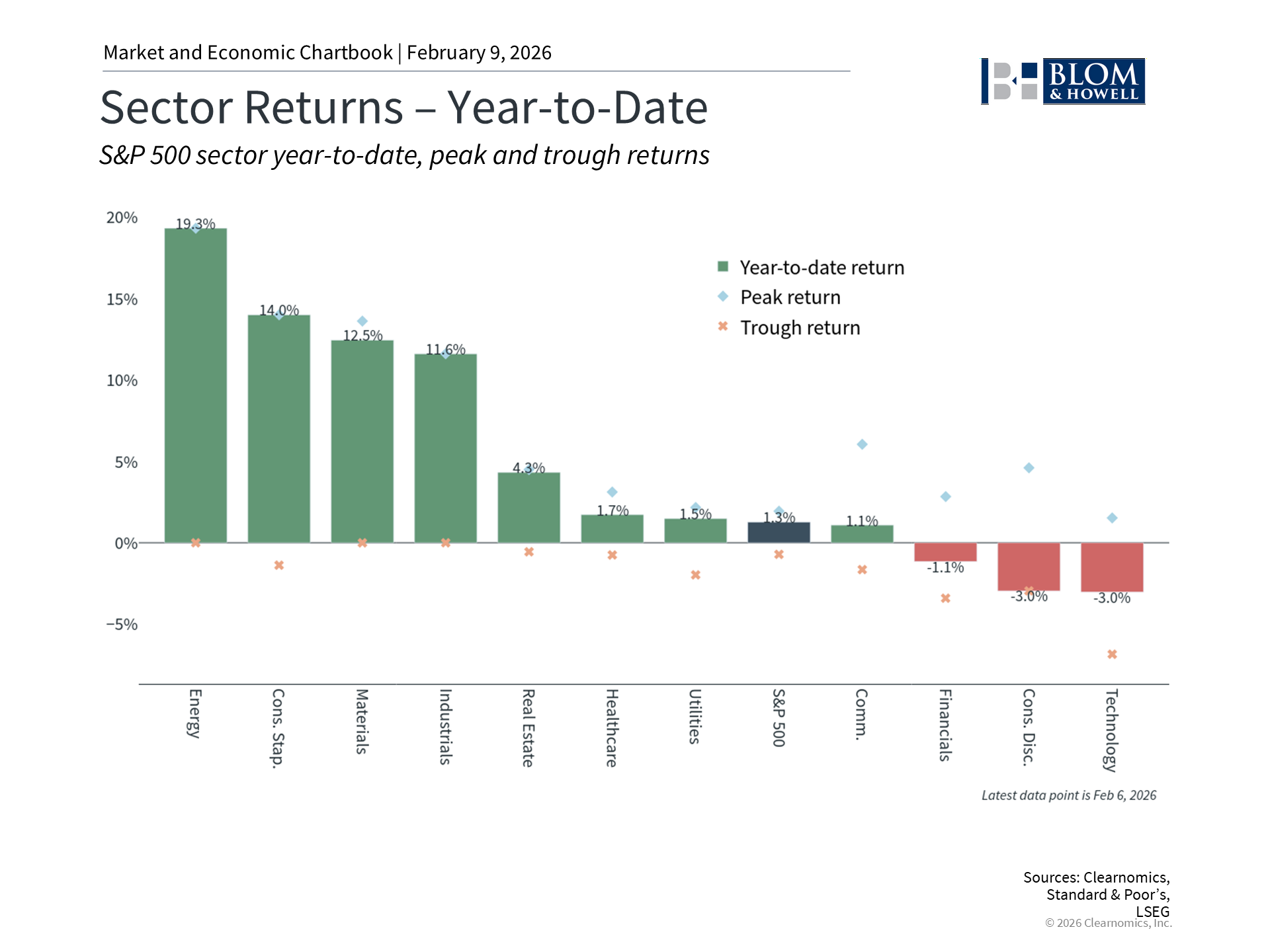 For investors, recent volatility underscores the principle that asset allocation matters more than any single trend or headline. The Information Technology and Communication Services sectors, while delivering strong returns in recent years, are also known to experience swings as expectations shift. These sectors are sensitive to long-term factors such as interest rates, and are thus affected by uncertainty around the Fed. So, while groups like the Magnificent 7 have performed well over the past several years, they can struggle in periods like 2022 just as they have over the past two months. Perhaps the biggest question is around stock market valuations. With the S&P 500's price-to-earnings ratio near historically elevated levels, investors have been rotating into other sectors such as Consumer Staples, Energy, Materials, and Industrials. This possibly reflects markets becoming more selective and focusing on opportunities beyond AI. After all, just because AI is the trend capturing investor attention does not mean there are not attractive opportunities across other parts of the market. It’s worth noting that cryptocurrencies have also experienced a significant pullback in recent months, with Bitcoin falling 50% to just above $60,000 before rebounding somewhat. This is a reminder that, from a portfolio perspective, cryptocurrencies remain highly volatile assets that can be sensitive to shifts in sentiment that often don’t have a simple explanation. For those interested in these assets, deciding how they fit into a balanced portfolio is far more important than trying to time the market. Ultimately, today’s AI trends should be viewed in a broader context along with other changes to the market and economic landscape. If past cycles are any indication, markets will likely over- and underreact to these trends in the short run. History shows that those who can stay patient and properly invested will be best positioned to achieve their financial goals. The bottom line? While AI is leading to a reassessment of specific stocks and sectors, the principles of long-term investing remain unchanged. Maintaining a portfolio aligned with your financial goals is still the best way to navigate periods of rapid change. |