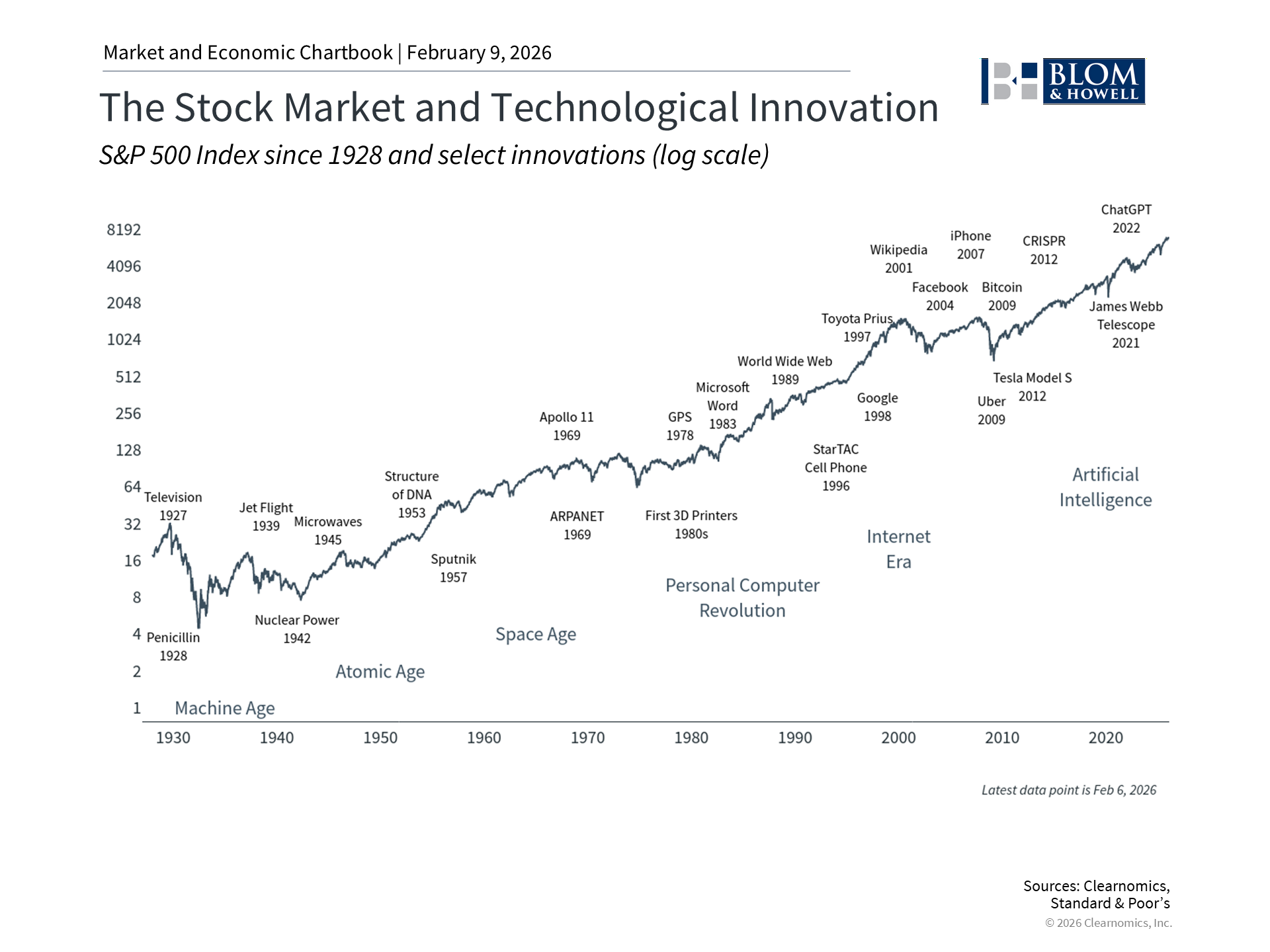 Fifteen years ago, venture capitalist Marc Andreessen famously wrote that "software is eating the world." What he meant was that any service that could be written and automated as software, would be. This has proved accurate as cloud computing, software-as-a-service, and digital platforms have reshaped both entire industries and how consumers buy goods and services. As investors, this has important implications and is a major source of recent market volatility. Today, AI represents the next phase of this transformation, and as with every major technological shift, markets are trying to assess what it means for specific sectors and the overall economy. For long-term investors, maintaining perspective on how these cycles have unfolded in the past can provide helpful clarity. Innovation and disruption are two sides of the same coin, and the recent broad sell-off and quick bounce back in technology stocks shows how difficult it can be to predict how these trends play out. The release of new automation tools from Anthropic, a major AI company, demonstrated the ability to perform tasks previously handled by specialized software in areas like legal and financial research. This sparked a reassessment of traditional software business models. The stocks of some large technology companies also struggled after reporting over a hundred billion dollars in quarterly capital expenditures on AI infrastructure, raising questions about whether this spending will pay off. Ironically, this occurred almost exactly one year after the "DeepSeek moment" in January 2025, when a Chinese AI company purportedly showed that AI models could be built at a fraction of the cost. In both cases, markets re-evaluated the winners and losers of technological change but also rebounded quickly once the dust settled. For investors, this is a reminder that maintaining a long-term perspective is important as the market shifts between the opportunities from innovation and the challenges of disruption. Technological disruption follows familiar patterns