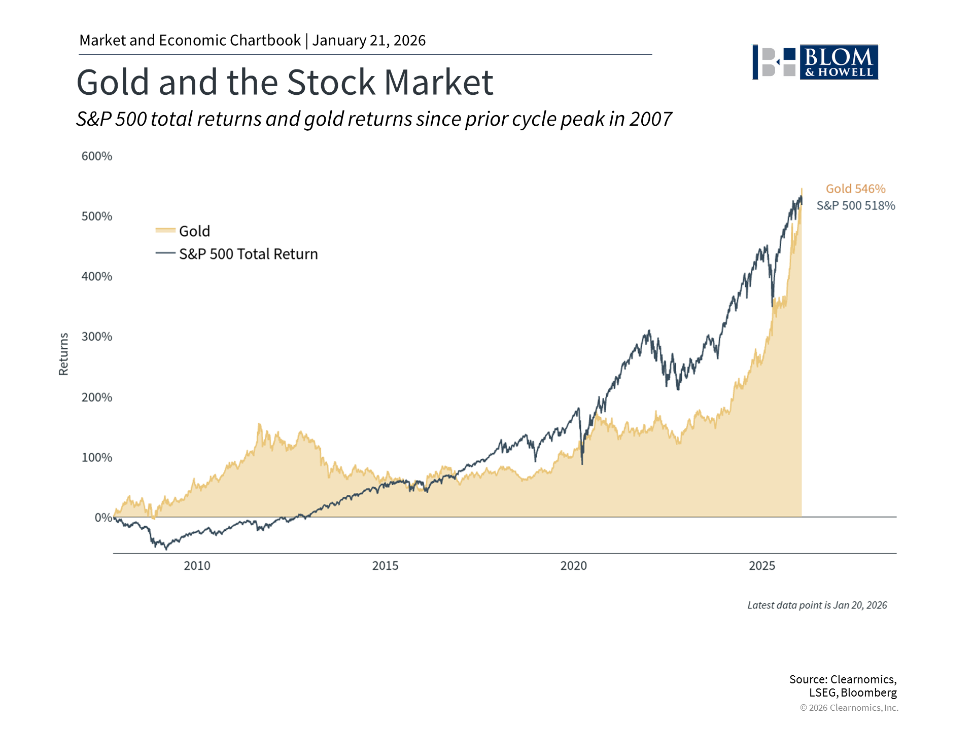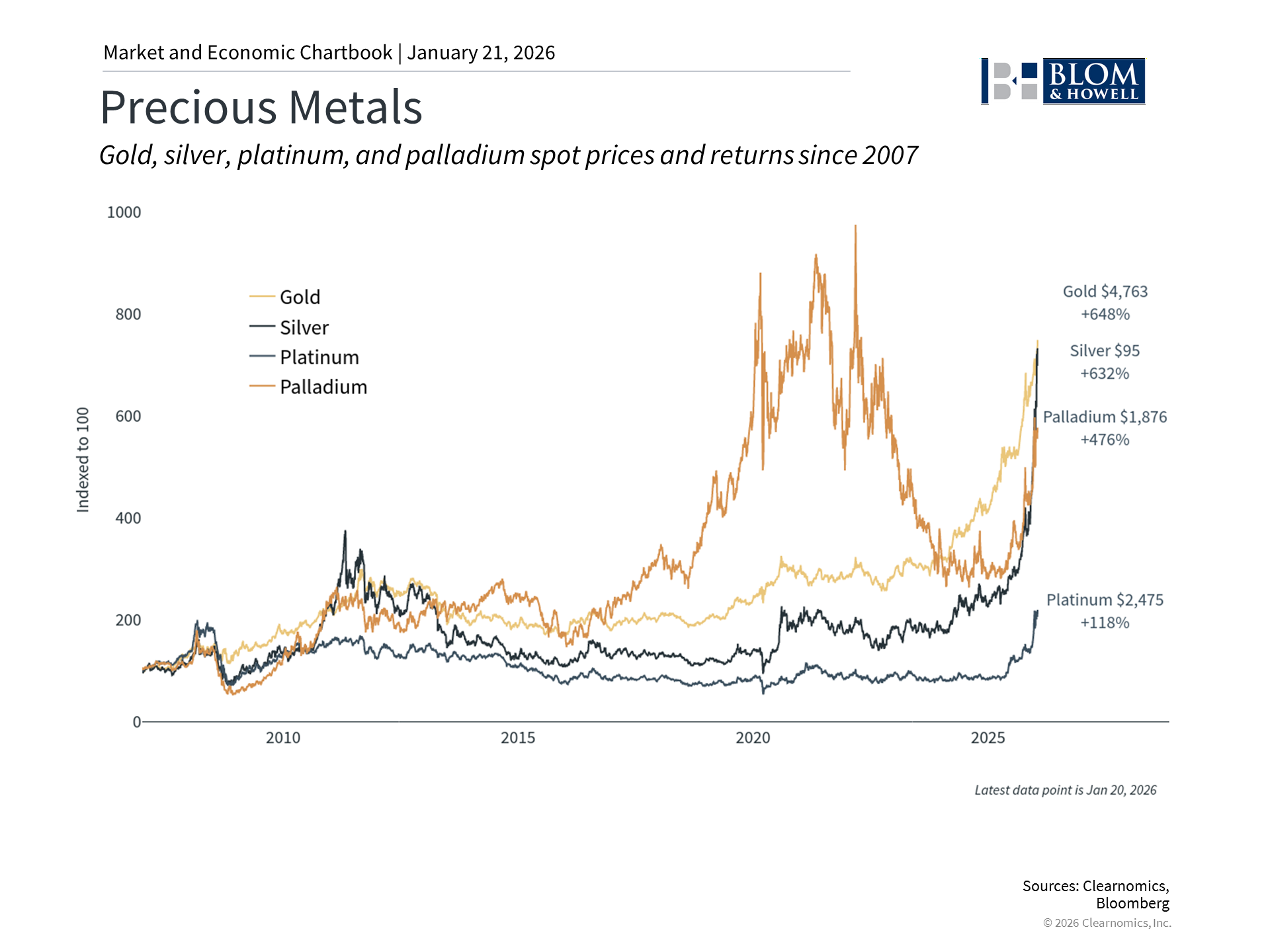 Gold, silver, and other precious metals have rallied over the past two years, capturing investor attention. Gold recently surpassed $4,700 per ounce while silver now trades above $90 per ounce, marking historic milestones for both metals. This strong recent performance may lead some investors to wonder whether they should be investing in these assets. As with all investments, it's important to maintain a broader perspective to understand their history and how they fit into a well-constructed portfolio. While many investors often turn to precious metals as "safe haven" investments, these and other commodities are prone to boom and bust cycles. In today's environment, the rallies in gold and silver are occurring alongside many other asset classes due to heightened uncertainty around monetary policy, fiscal policy, and geopolitical risk. It's important to view these assets not as speculative trading instruments, but as components of a broader investment strategy aligned with financial goals. Precious metals often respond to uncertainty