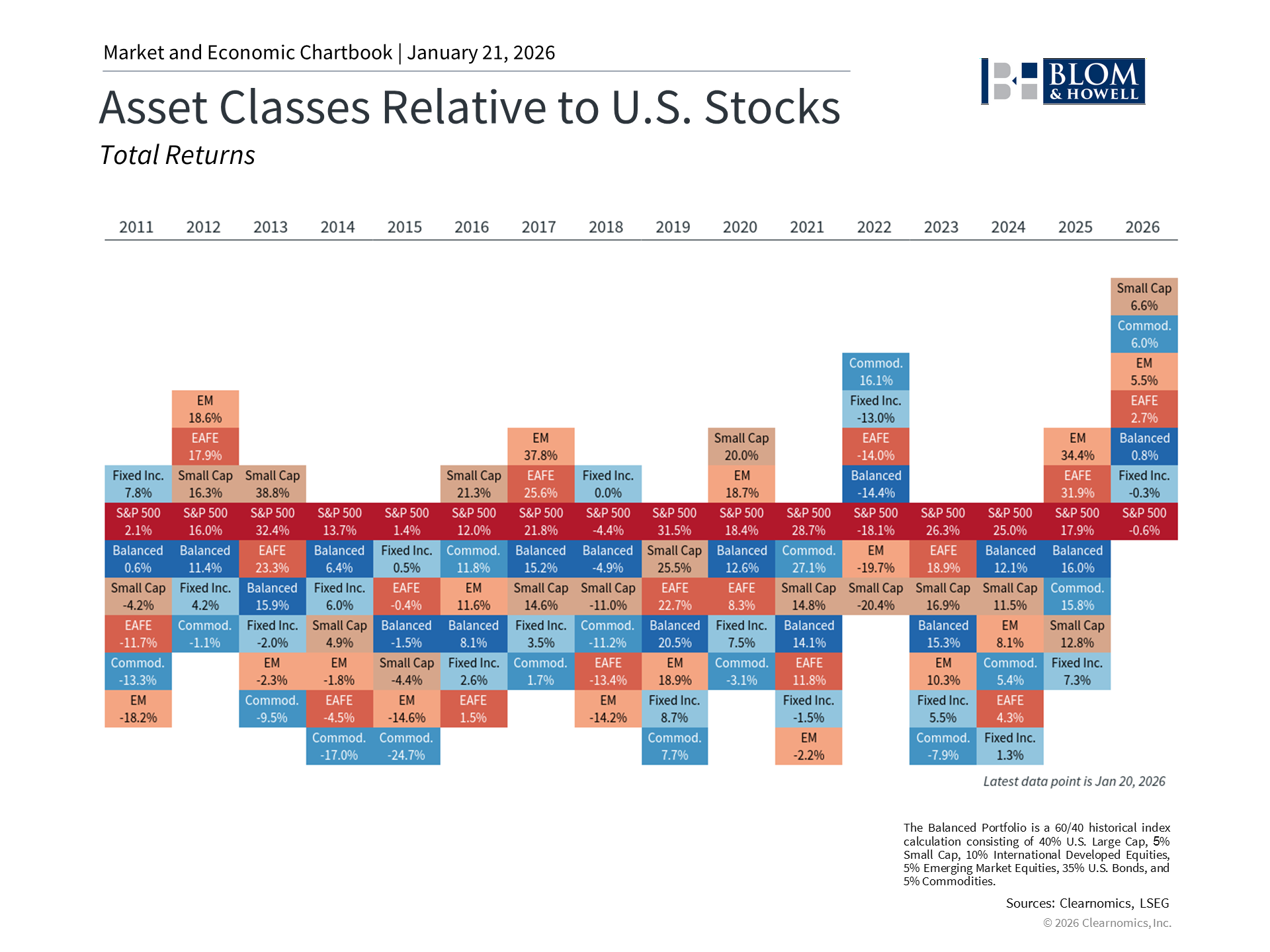 These episodes demonstrate that, in situations where it makes sense for investors to have exposure to precious metals and commodities, gold and silver are best viewed as components of a broader commodities allocation or as part of alternative investments. The Bloomberg Commodity Index, for instance, currently allocates 14.9% to gold and 3.9% to silver, alongside other commodities such as industrial metals, energy, and agricultural products. This diversified approach to commodities exposure helps manage the volatility inherent in any single commodity. The case for including precious metals in portfolios is based on the fact that they behave differently from stocks and bonds. Their value derives from scarcity, their roles as stores of value, and industrial uses. This means they often react to market and economic events differently from traditional asset classes, which can help to stabilize portfolios. However, precious metals also carry important limitations. Most notably, they generate no income, unlike bonds or dividend-paying stocks. This lack of income also makes these assets difficult to value, which is another reason they are prone to booms and busts. A portfolio inappropriately weighted toward gold and silver may sacrifice the long-term growth potential of equities and the income generation of fixed income. So, even if precious metals might help in specific market environments, they may not be aligned with long-term goals. The accompanying chart shows that many asset classes have contributed to portfolio returns recently, not just precious metals. While gold and silver have certainly performed well, there will always be individual investments that shine in particular periods. The key is constructing portfolios that can benefit from various market conditions rather than concentrating on recent winners. The bottom line? Gold and silver have experienced rallies over the past two years, but long-term investors should view them in a portfolio context. Their value lies not in their recent performance, but in how they contribute to portfolio balance across different market environments. |