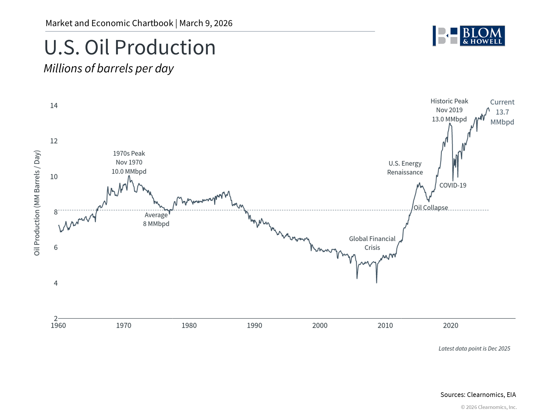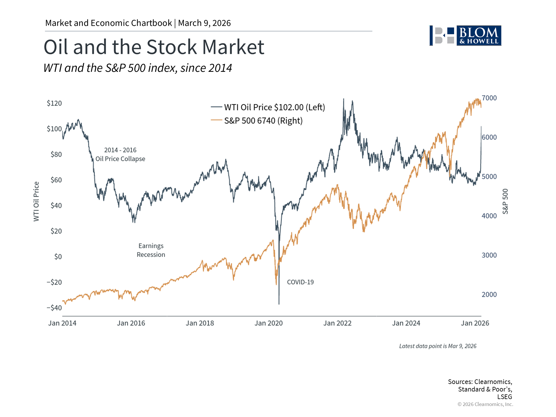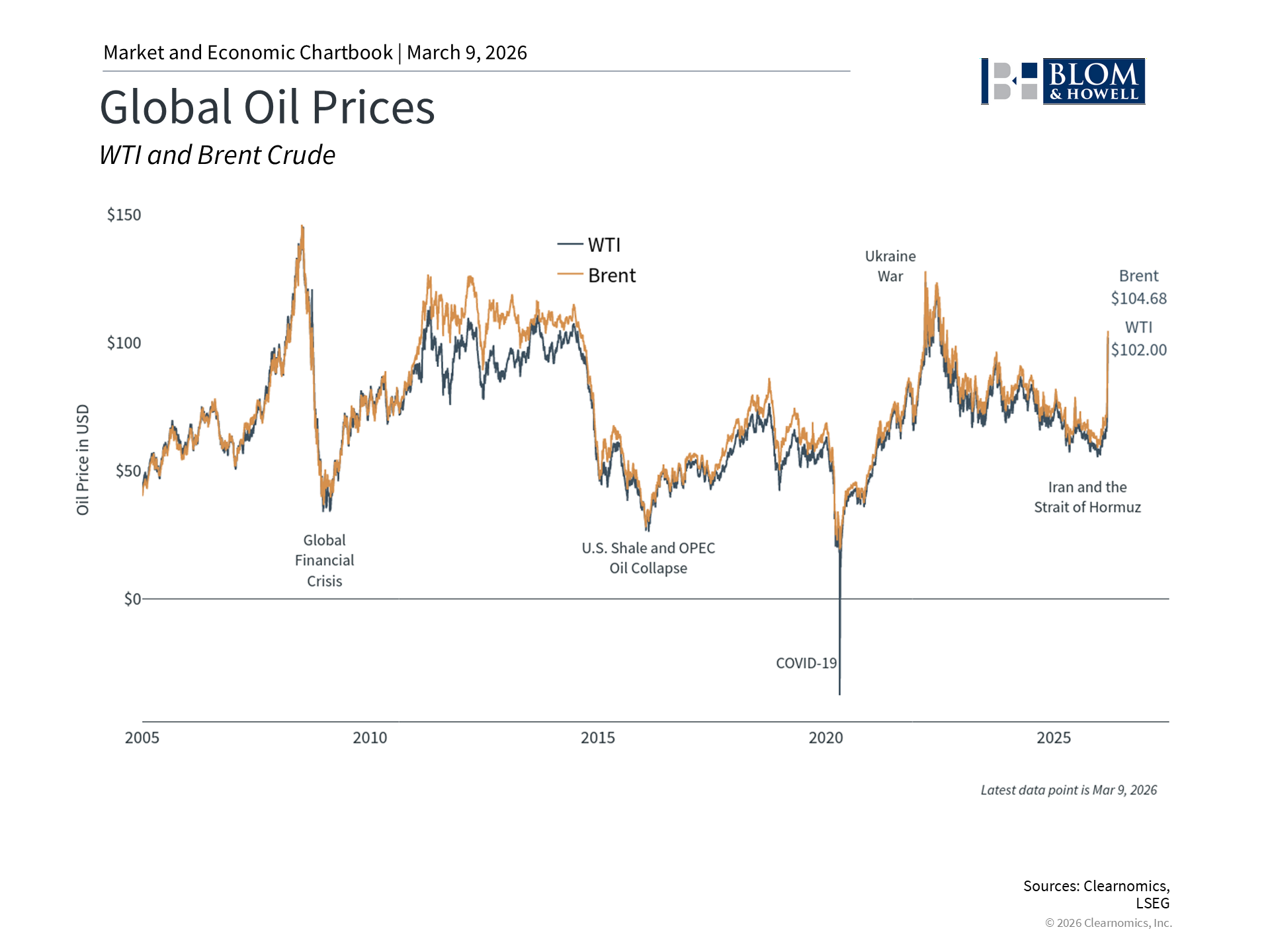 The ongoing conflict in Iran and the effective closure of the Strait of Hormuz have pushed oil prices sharply higher. Both Brent crude and WTI have jumped from around $70 per barrel to around $100 in just a few days, approaching levels last seen in 2022 when Russia invaded Ukraine. This has driven significant uncertainty across global markets, with headlines mentioning a “global economic downturn,” “stagflation,” and more. The safety of civilians and our troops is the most important consideration in this conflict. Still, for investors, history suggests that maintaining a longer-term perspective is the best way to achieve financial success when faced with significant uncertainty. A quote often attributed to Winston Churchill is "the farther back you can look, the farther forward you are likely to see." The same could be said of energy price shocks which have occurred every decade or so. While each situation is unique, there is a clear pattern of oil prices surging in response to geopolitical conflict, the resulting market volatility, and the subsequent calm and recovery. The situation is unfolding in real time and there are no guarantees as to when there will be stability in the region or in financial markets. Events over the past few years including other Middle East conflicts, inflation, trade wars, and Venezuela earlier this year, all provide important context and perspective. What should investors keep in mind in the coming weeks? Why oil has climbed to $100