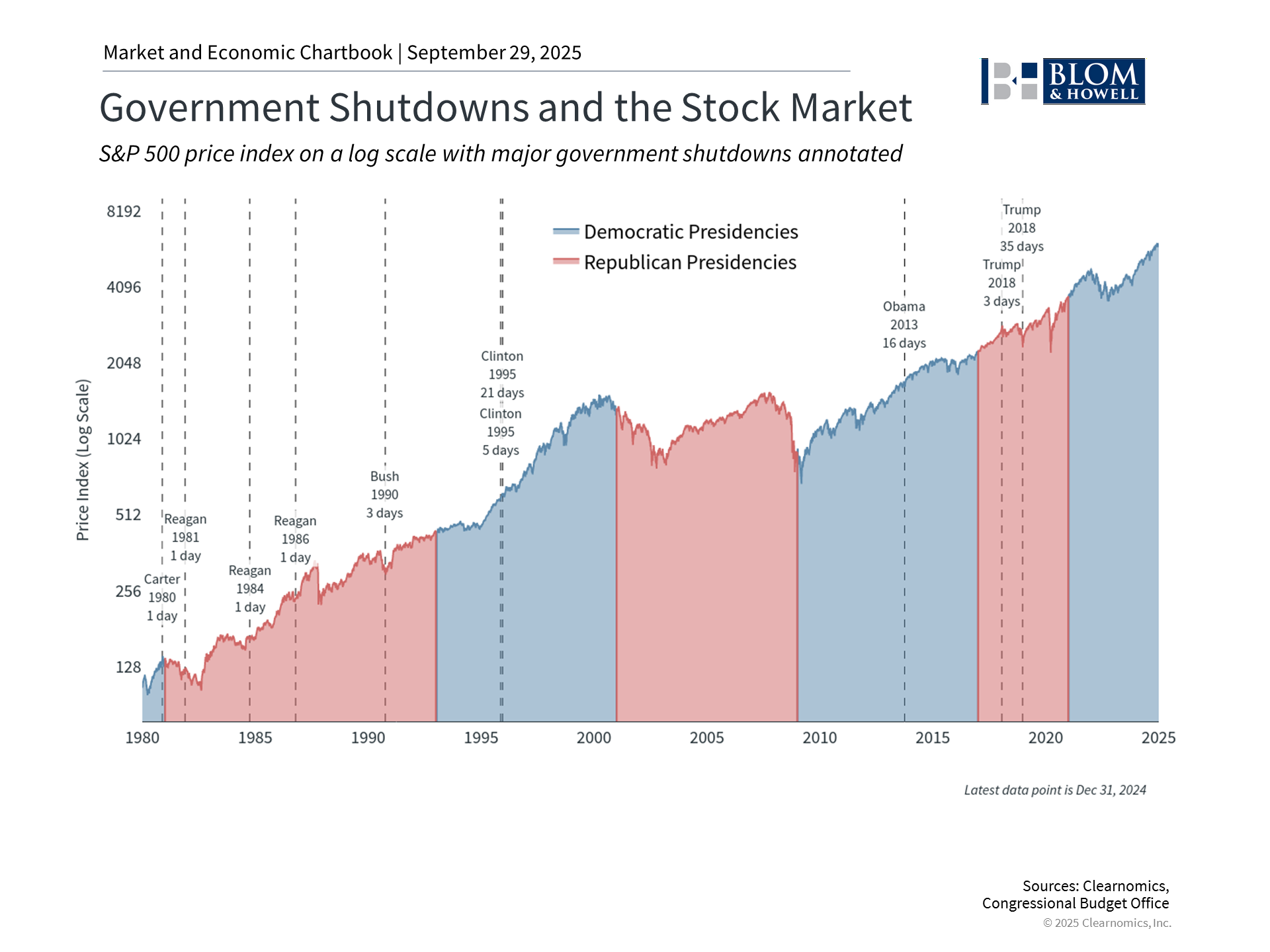 Washington is back in the headlines as the federal government faces a shutdown if policymakers can't reach a new funding agreement. This adds to a year in which government policies around trade, taxes, immigration, and more have created uncertainty for the economy and markets. For investors, it's natural to wonder how politics might affect their portfolios, especially for those concerned about the size of the budget deficit and national debt. Understanding the historical patterns, and why markets generally look past them, can help investors maintain perspective during periods of political gridlock. Political drama in Washington can create uncertainty, but history shows that government shutdowns typically have limited impact on financial markets. While the toll that shutdowns have on government workers can be real, their effect on financial markets has historically been minimal. For long-term investors, these episodes highlight the need to separate political views from financial plans. This is especially important when daily headlines focus on controversial topics that have not historically affected portfolios. Government shutdowns have not historically affected markets or the economy