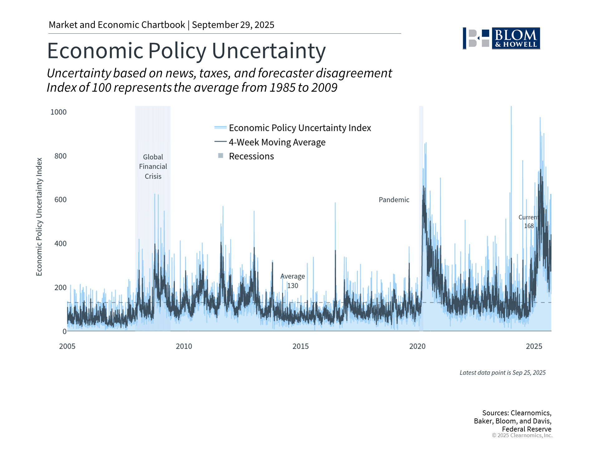 So, while many investors have concerns over the fiscal trajectory of the country, government shutdowns have generally been uneventful for financial markets. The reason is straightforward: shutdowns are temporary disruptions that don't change underlying economic fundamentals. Shutdowns can affect economic data reporting, which may temporarily affect important data used by investors and economists such as the Bureau of Labor Statistics’ jobs report and Consumer Price Index. However, this typically only delays the data, with reporting resuming once the shutdown ends. They can also create modest headwinds for economic growth if they last long enough, as federal workers delay spending and government services are disrupted. As the Economic Policy Uncertainty chart above demonstrates, tariffs and taxes earlier this year created significant challenges for investors. However, with recent clarity around both issues, this measure has fallen toward the longer run average. While a shutdown could always result in greater uncertainty, history shows that even longer government disruptions have not generally impacted investors. The bottom line? Government shutdowns may dominate headlines, create challenges for federal workers, and disrupt important services, but they have historically had minimal impact on financial markets. Investors should continue to focus on their financial plans rather than daily events in Washington. |