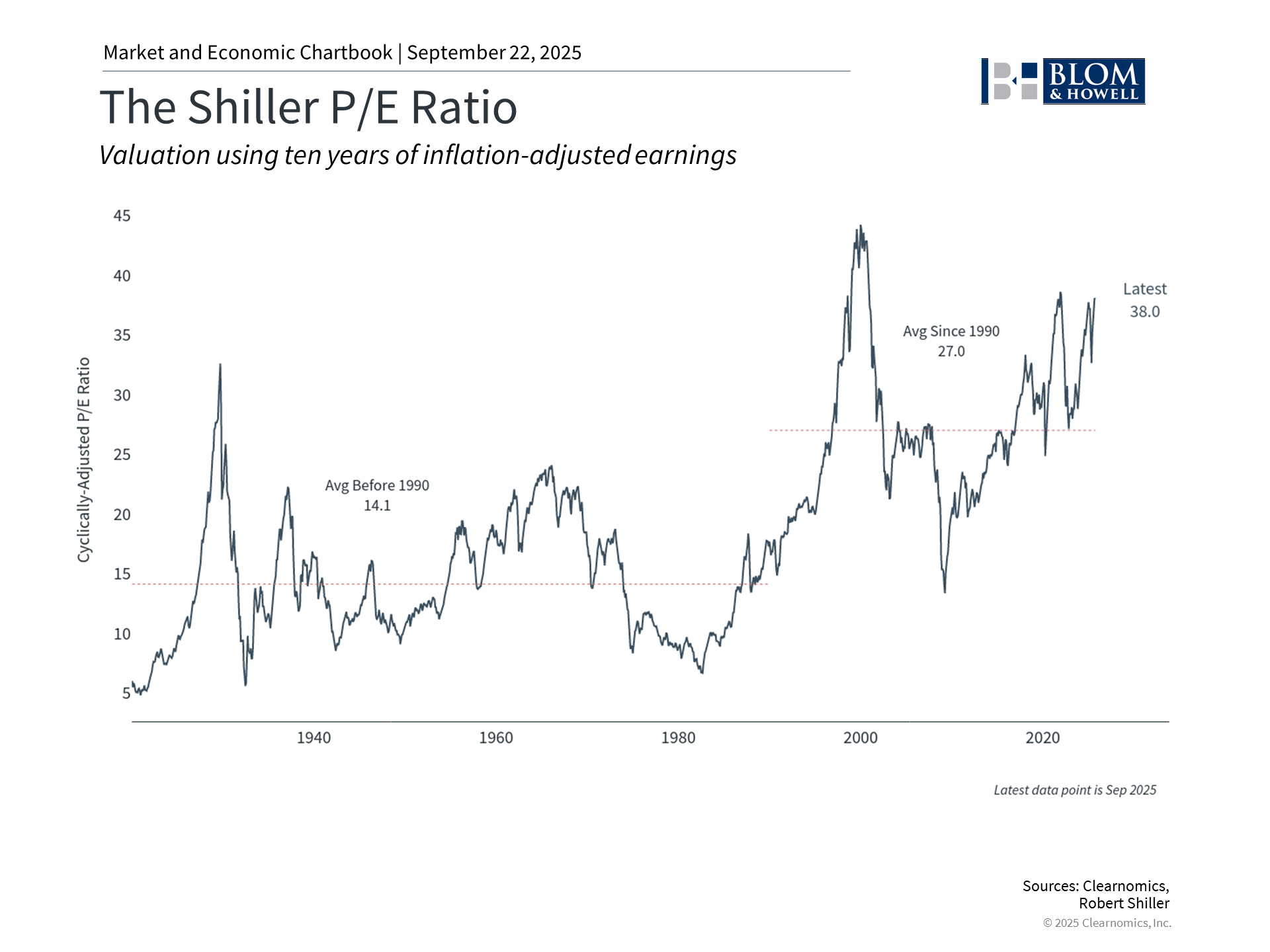 To distinguish between short-term pullbacks and the fear of a potential bubble, it's important to consider the concept of value. As with everything in life, what matters in investing isn't just what price you pay but what you get for your money. After all, the reason investors buy stocks is to own a part of a business and its cash flows. Valuation metrics such as price-to-sales or price-to-earnings tell us not just the price of a share, but what we're getting for that price. The accompanying chart shows the Shiller price-to-earnings ratio which provides perspective on long-term valuation trends by using inflation-adjusted earnings over the past ten years. The current level of 38x, which means that investors are paying $38 for each dollar of historical earnings today, is well above the average of 27x. This has fluctuated over the past few years as markets have navigated inflation, policy uncertainty, and volatility in technology stocks. With many measures showing that the stock market is expensive by historical standards, there are a few key points for investors to keep in mind. First, it's important to emphasize that valuations do not reliably predict stock market returns in the near term. Instead, they tell us how much investors are willing to pay based on their expectations about the future. Even when stocks appear expensive, markets can continue rising for months or years if business fundamentals remain strong. This is why trying to time the market can often be counterproductive. Second, while there are parallels to the 1990s tech boom since both periods feature high valuations and excitement around new technologies, there are some key differences. Unlike the unprofitable dot-com companies of the past, current market leaders are well established, have strong profitability, and healthy balance sheets. Just as the information technology revolution ultimately benefited all types of companies over the past few decades, so too could developments in artificial intelligence. Third, not all bubbles “pop.” While valuations can come back to Earth if prices fall, they can also improve if earnings and other fundamentals remain strong. Some of the enthusiasm experienced by the market today is in anticipation of higher future earnings. Corporate performance has justified some of these expectations in recent quarters with earnings growth coming in stronger than many had anticipated. Opportunities exist across a range of styles and sizes