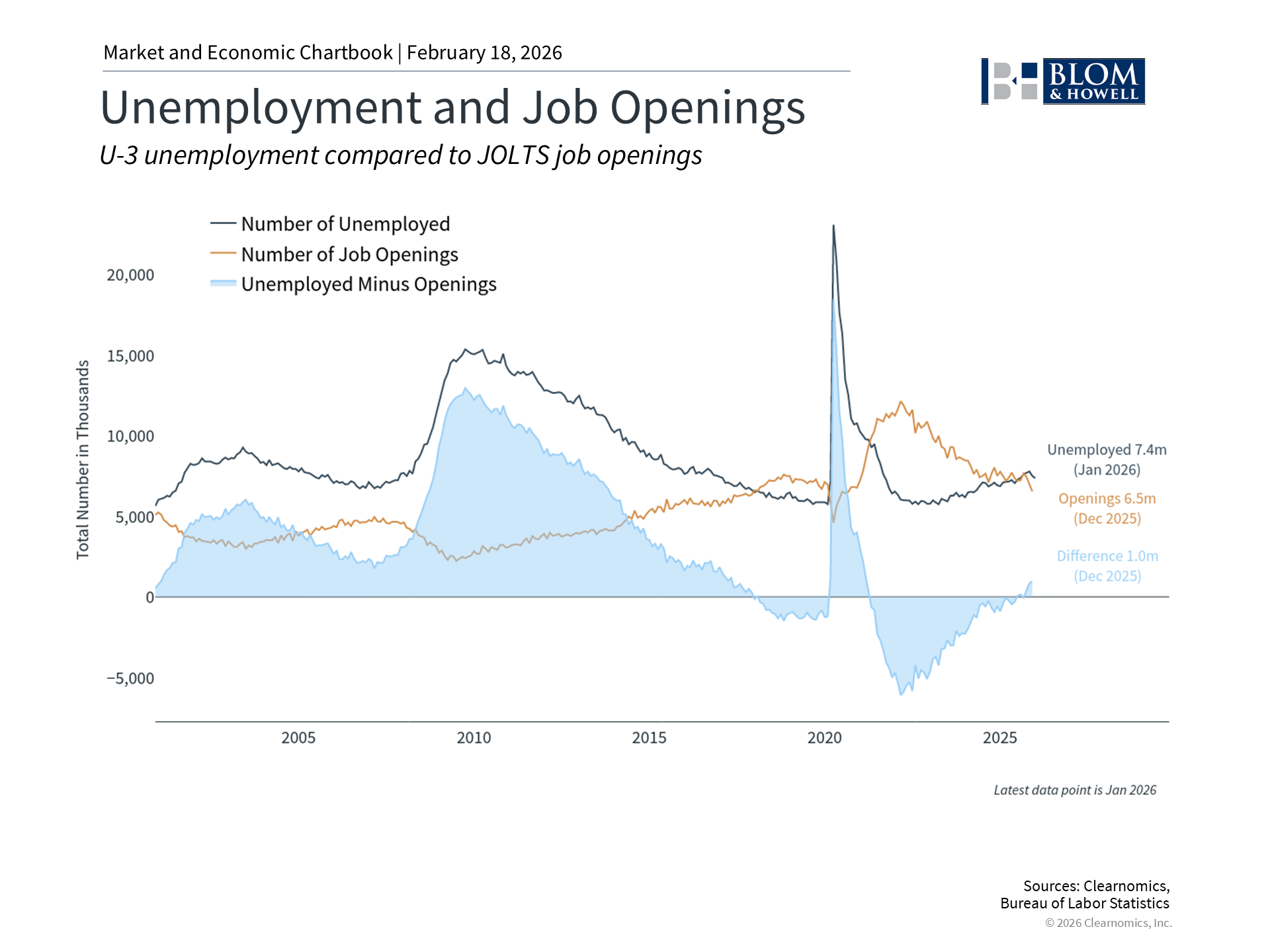 Understanding the labor market has been challenging over the past several months due to government shutdowns that delayed data, bad weather, and other factors. For individuals, perhaps the biggest shift is in the balance between job seekers and job openings. As the accompanying chart above shows, the post-pandemic period experienced several years in which there were more openings than unemployed individuals. This ratio was above one from mid-2021 until last summer, reaching as high as two positions per job seeker in 2022. Today, there are about 7.4 million unemployed Americans but only 6.5 million job openings, the fewest unfilled positions since late 2020. Still, the January jobs report offered good news by showing that the economy added 130,000 jobs that month, nearly double what economists had expected. Many of these jobs were concentrated in the health care, social assistance, and construction sectors. The unemployment rate ticked down to 4.3% from 4.4% and remains near historically low levels. On its own, this could suggest that the labor market is rebounding. While these numbers are positive, the broader trend has been challenging. Specifically, the Bureau of Labor Statistics published their annual revisions which are based on more accurate data than was available at the time of each monthly report. It showed that the number of jobs created over 2025 was only 181,000, or about 15,000 per month, the weakest annual total since 2020. For context, healthy job gains are typically measured in the millions per year, prior to these revisions. Why has the overall unemployment rate stayed relatively low despite slower hiring? Part of the answer lies in demographics and immigration. The Census Bureau recently reported a historic decline in net international migration, which fell from a peak of roughly 2.7 million in 2024 to about 1.3 million in 2025, with further declines expected. Additionally, an aging population and lower labor force participation mean there are simply fewer people entering the workforce. In other words, both the supply and demand sides of the labor market are cooling, which has helped keep the unemployment rate from rising. Jobs, inflation, and the broader economy