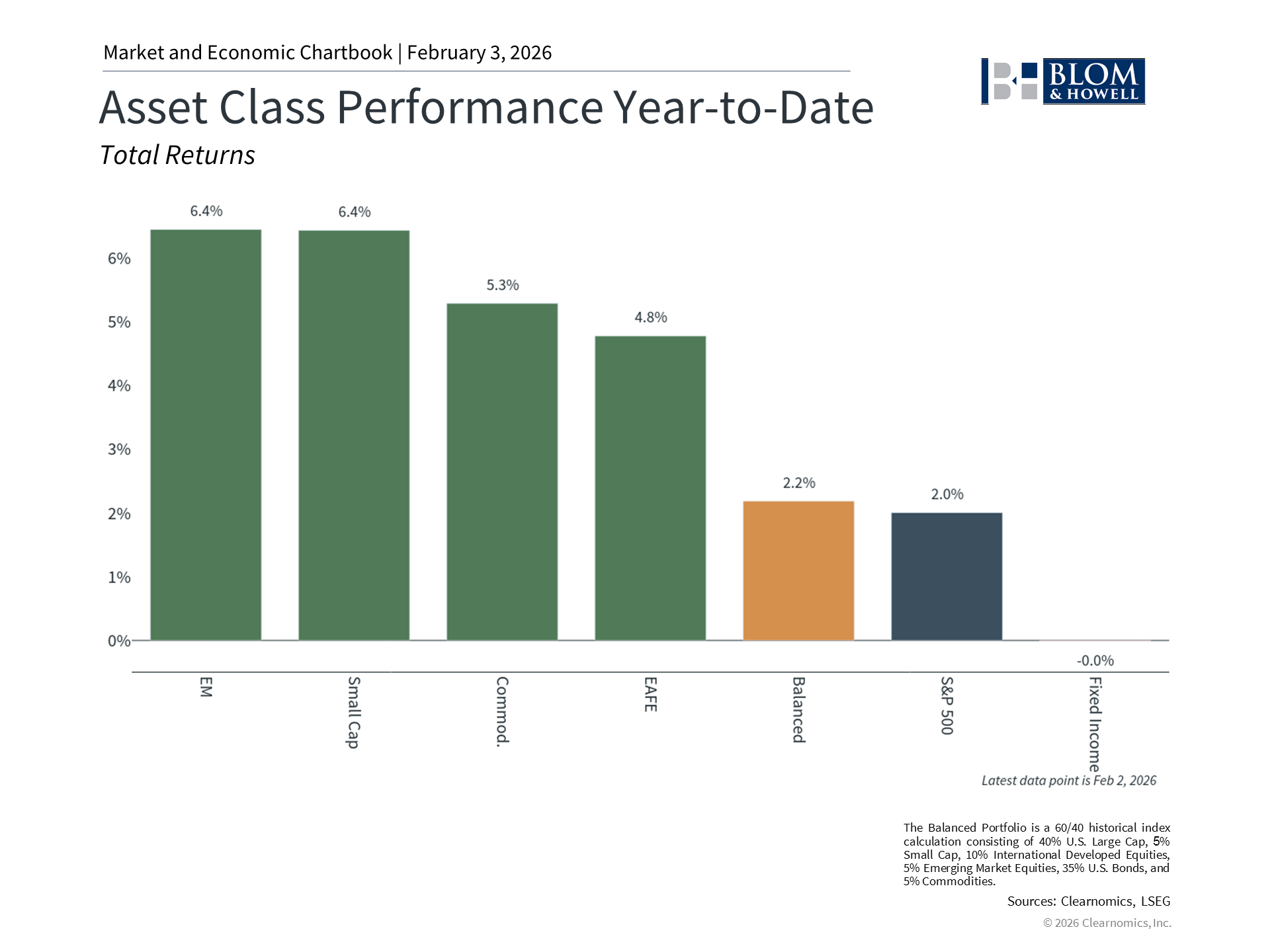 The start of the year was positive for stocks and bonds, continuing the rally from recent years. This might be surprising to some investors since there were several periods of volatility driven by geopolitics and Federal Reserve policy. While headlines created short-term swings, including the S&P 500's worst day since last October, markets rebounded quickly. Within days, major indices reached new all-time highs, driven also by healthy corporate earnings that have supported portfolios. For long-term investors, January serves as a valuable reminder that headlines can move markets in unpredictable ways, but fundamentals and long-term planning are what matter most. While geopolitical events and policy uncertainty will likely create more volatility throughout 2026, the best way to navigate these challenges remains a balanced portfolio aligned with your long-term financial plan. Key Market and Economic Drivers in January • The S&P 500 gained 1.4% in January and briefly crossed 7,000 for the first time on an intra-day basis. The Nasdaq Composite rose 0.9% and the Dow Jones Industrial Average gained 1.7%. • The CBOE VIX volatility index ended the month at 17.44 after rising above 20 due to geopolitical tensions. • The Bloomberg U.S. Aggregate Bond Index climbed 0.1% over the month as long-term interest rates rose. The 10-year Treasury yield ended the month at 4.24%, the highest level since last September. • International developed markets jumped 5.2% in U.S. dollar terms based on the MSCI EAFE Index, while emerging markets gained 8.8% based on the MSCI EM Index. • President Trump announced the nomination of Kevin Warsh as the next Fed Chair. If confirmed by the Senate, he would take office in mid-May. • Gold surged to a record close of $5,417 per ounce before plunging nearly 10% on January 30. • Similarly, silver closed as high as $116.70 before tumbling to finish the month at $85.20. • The U.S. dollar index fell further to about 97.0, reaching its weakest level in nearly four years, before rebounding slightly following the Fed Chair news. • The Federal Reserve held its policy rate at 3.50 to 3.75% at its January meeting, following three consecutive quarter-point cuts in the second half of 2025. • Consumer Price Index inflation remained at 2.7% year-over-year in December, still above the Fed's 2% target. The Producer Price Index accelerated to 3.0%. • Washington ended the month with a partial government shutdown. • Severe winter weather across much of the Eastern and Southern United States caused natural gas and electricity prices to spike. Geopolitical tensions edged market volatility higher