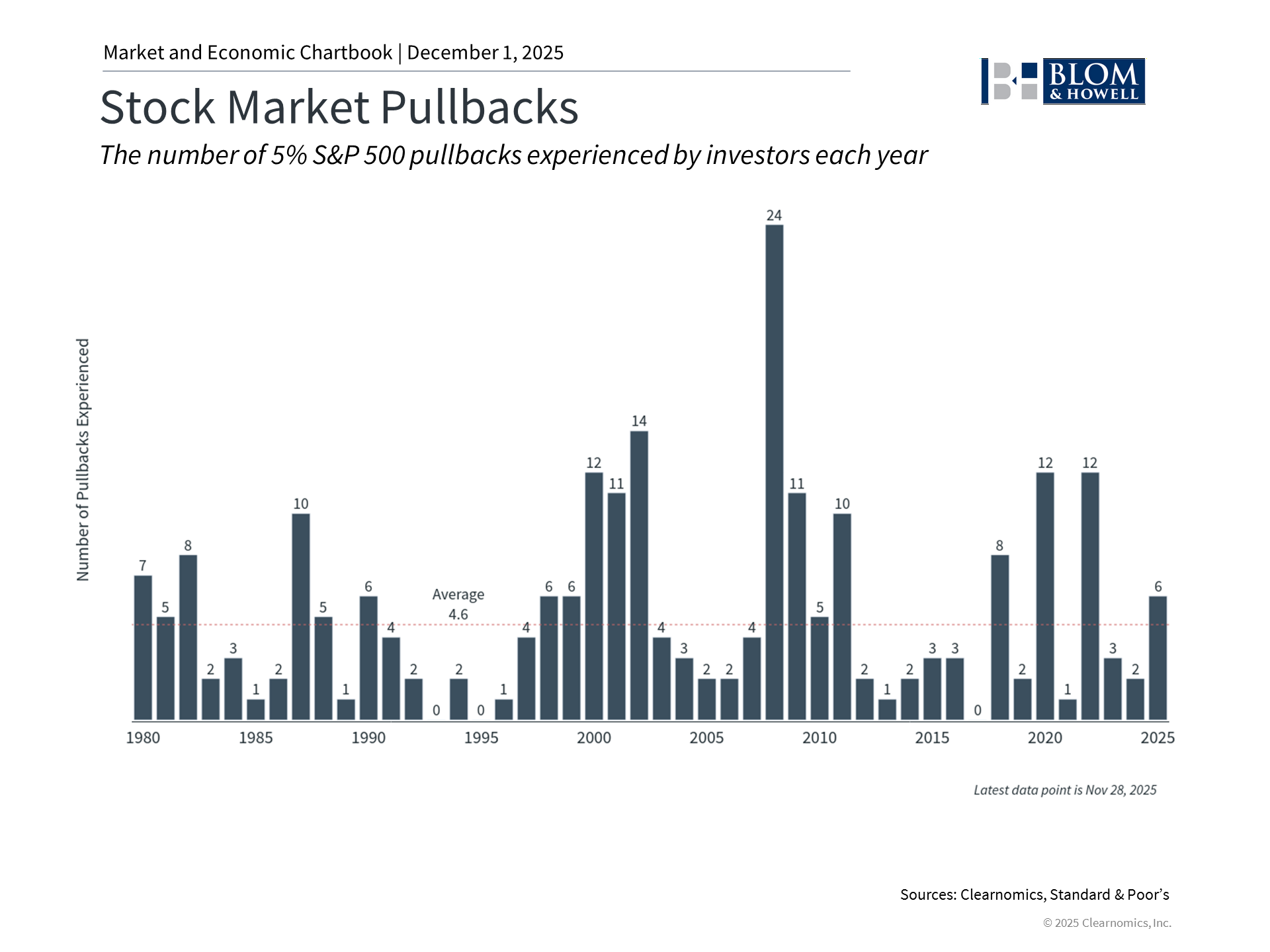 November saw investors temporarily move away from risk assets such as technology stocks, high-yield bonds, cryptocurrencies, and other investments. This was primarily due to questions around the sustainability of AI investments and investors adjusting their expectations around upcoming Fed rate cuts. There have now been six declines of 5% or worse for the S&P 500 this year, the most since 2022 but still close to the historical average. Some major asset classes rebounded in the final days of the month, and the S&P 500 ended slightly positive. During the month, AI-related technology stocks experienced their worst week since April. Concerns about their spending and debt levels, profit margins, and questions around a potential bubble created volatility. Yet beneath this, fundamentals remained strong with companies such as Nvidia reporting healthy revenue and earnings growth for the third quarter. Some stocks, including those in the Magnificent 7, rebounded following these reports. Cryptocurrencies experienced a sharp correction during this risk-off period. Bitcoin fell over 30% from its early October highs above $125,000, briefly trading below $85,000 and wiping out its year-to-date gains. While the adoption of cryptocurrencies by investors has grown, such periods demonstrate that these and similar assets can be highly speculative and prone to boom-and-bust cycles. For this reason, ongoing risk management and maintaining a proper asset allocation continue to be important. The bond market rose in November, partly driven by a decline in long-term interest rates with the 10-year Treasury yield briefly falling below 4% once again. This was the result of new expectations around government policy which could result in lower rates in the long run. Year-to-date, the Bloomberg U.S. Aggregate Bond Index has gained 7.5%, the best performance since 2020. This has helped provide balance to diversified portfolios. The government shutdown ended but economic uncertainty remains