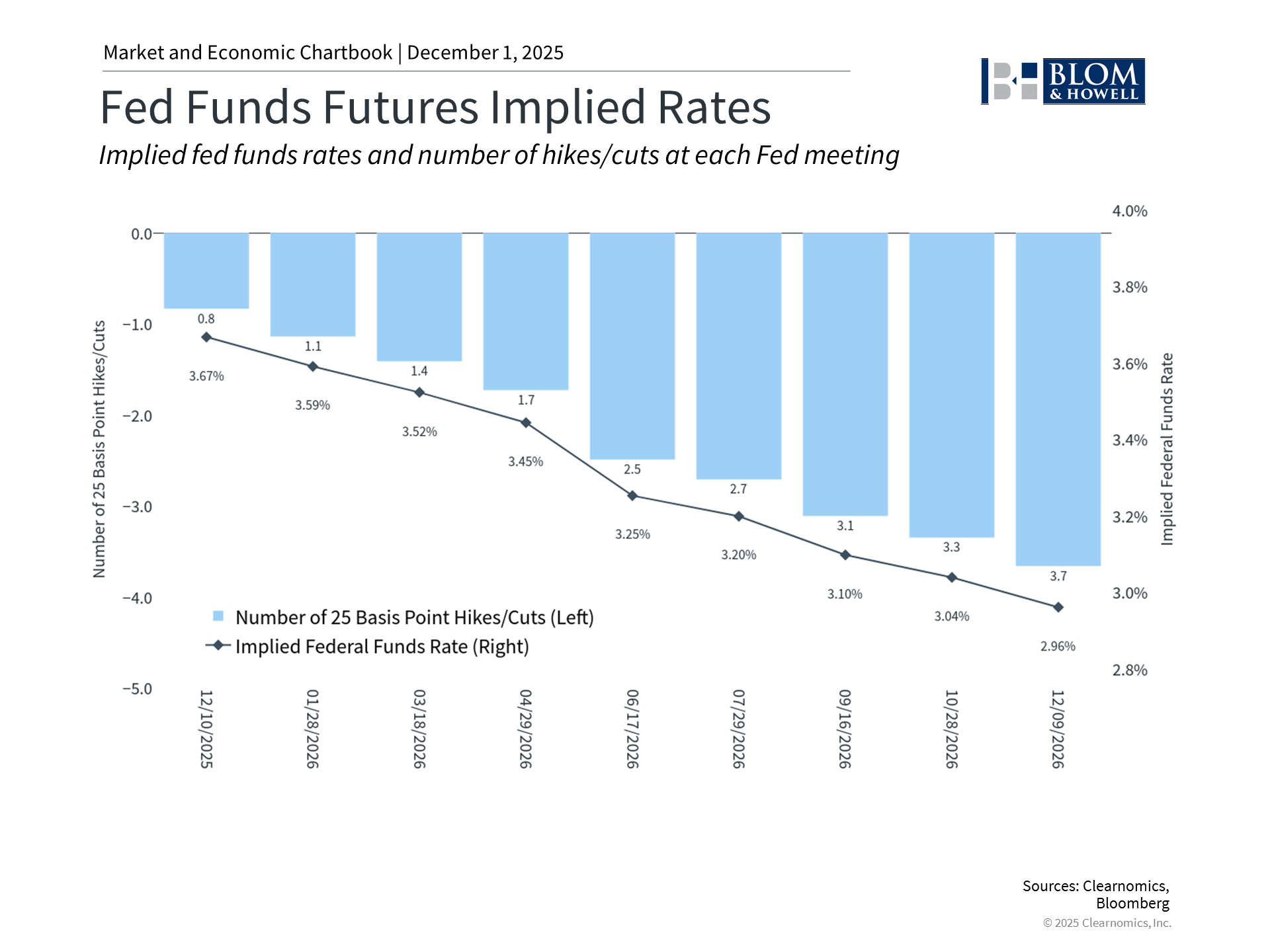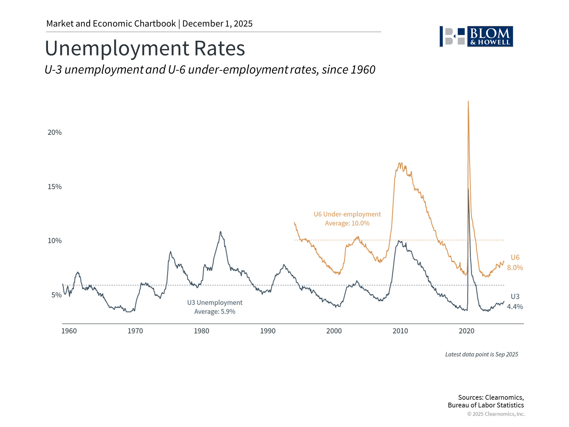 The longest government shutdown in history ended after 43 days, but the federal government will only be fully funded through the end of January 2026. This means that political uncertainty will be in the headlines again in only a couple of months. That said, markets were generally able to look past the shutdown, even with greater challenges due to a lack of economic data. The Bureau of Labor Statistics released the long-awaited September jobs report, which was originally scheduled to be published in October. This report showed that job gains exceeded expectations that month, rebounding from weakness over the summer. However, the revised figures show that 4,000 jobs were lost in August, the second month of negative jobs growth this year. The unemployment rate edged up to 4.4% in September, its highest level since October 2021, although this is still low by historical standards. A full October jobs report will not be published since surveys of households and businesses were not conducted during that month, but some of the data will be published with November’s report on a delayed basis. Market expectations for the next Fed rate cut have shifted