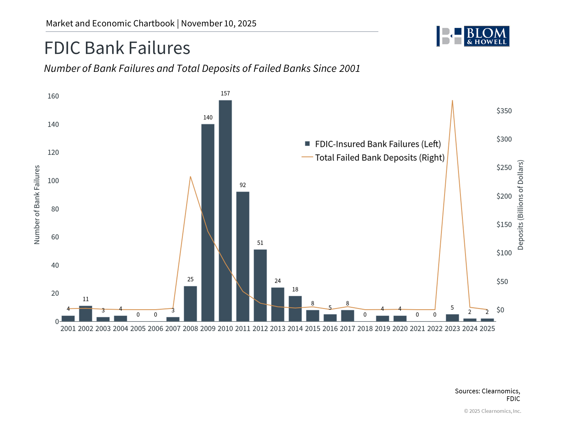 Throughout history, it has often been credit and debt cycles that have driven the most significant economic expansions and contractions. When there is abundant liquidity in the financial system, there is often more credit being extended to both businesses and individuals. This pattern of lending and borrowing during expansionary periods has repeated itself across different eras, from the railroad boom of the 1800s, to the roaring twenties a century ago, to the housing bubble of the mid-2000s. However, it’s important to distinguish the perspective of a large bank from that of long-term investors. For large financial institutions, each loan matters and can result in write-offs that affect quarterly earnings. For investors, what matters is whether these issues are “systemic,” affecting the broader economy and portfolios across a variety of investments. The situation is still evolving and there could be more cases of fraud and bad loans. However, markets have already calmed after the initial bankruptcy reports, and there are a few key facts to keep in mind. First, the dollar amounts involved, while significant for individual institutions, represent a small fraction of the overall financial system. Second, larger banks are generally well-capitalized and diversified across many lending categories, reducing their vulnerability to problems in any single area. Third, unlike past crises, there's no evidence yet of a broader economic challenge that would cause widespread credit problems. The chart above shows that the banking system has been more stable over the past two years. Stock and bond markets have remained relatively calm