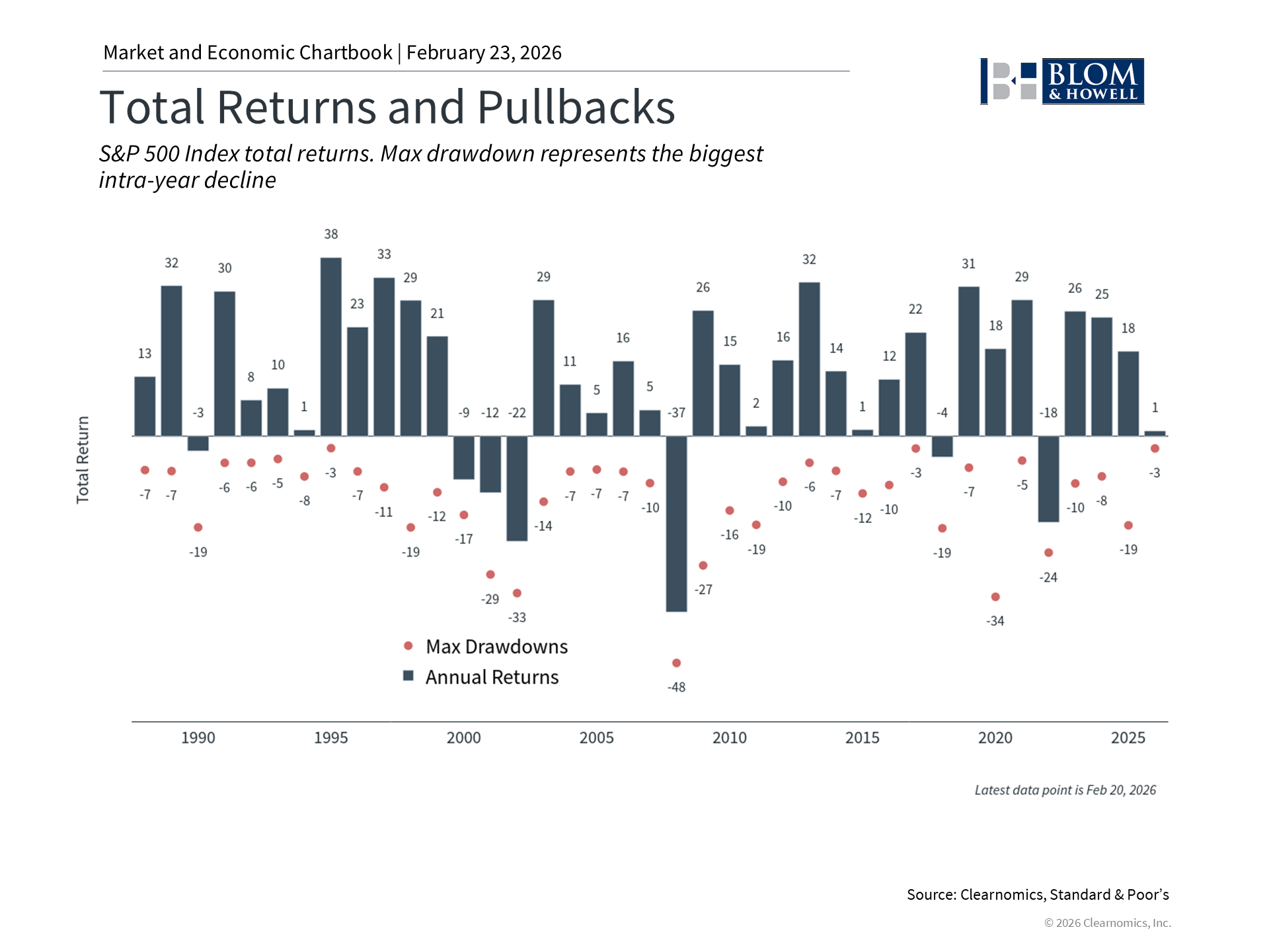 Economics is sometimes called the “dismal science” since it has a poor track record of predicting the response to major policy shocks. When tariffs were raised to their highest levels since the Great Depression, many feared demand destruction, rising inflation, a strengthening dollar, and struggling markets. Why did this not fully materialize? First, the level of tariffs changed quickly and repeatedly. The 90-day pause announced just one week after Liberation Day dramatically reduced the effective tariff burden on most trading partners. The highest announced rates never truly went into effect except with a few trading partners. Second, companies responded by stockpiling imported goods well ahead of the April deadlines. This was clearly visible in the trade data, which showed a significant spike in imports in the first quarter of 2025 as businesses front-loaded purchases. This meant that the immediate inflationary impact was cushioned, at least temporarily. Third, and perhaps most importantly for markets, the underlying fundamentals of the economy remained solid. Inflation has continued to moderate, with the Consumer Price Index rising just 2.4% year-over-year in January 2026. Real GDP grew at a modest but healthy 2.2% pace for all of 2025, according to the latest report from the Bureau of Economic Analysis. Corporate earnings continue to be strong as well, supporting valuations and long run growth. Of course, this is not to say that tariffs had no impact. The federal government collected hundreds of billions of dollars in tariffs which were paid by both consumers and businesses. But the experience of the past year is a reminder that economic outcomes are rarely as straightforward as the headlines suggest, and that is why it’s important investors do not react to worst-case scenarios. The clearest lesson from the past year of tariff volatility is one that applies to virtually every period of market and policy uncertainty: by far the best thing investors could have done was to stay invested. Trying to predict the precise effect of tariffs on the economy and markets is not only difficult, but counterproductive. As the accompanying chart shows, years with significant intra-year pullbacks have very often still ended with positive returns. The bottom line? It’s important to separate political views from portfolios and financial plans. Trade policy, legal battles, and political debates are important for taxpayers and voters, but they often lead to the wrong investment decisions. The history of markets shows that economic fundamentals, corporate earnings, and investment principles matter far more to achieving financial goals. |