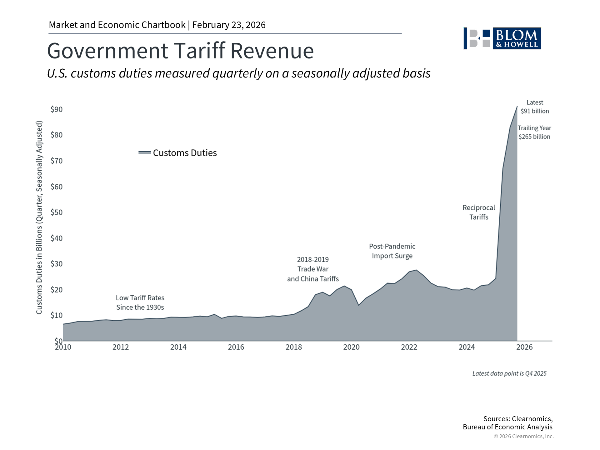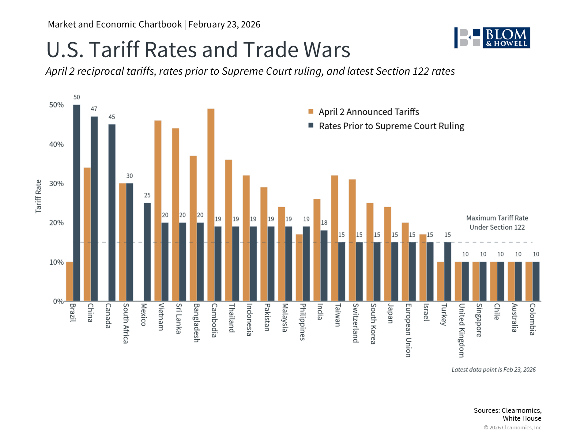 To understand the implications for investors, it helps to understand what this ruling means. Presidents have several legal tools available to impose tariffs, each with different rules around rates, duration, and scope. The reciprocal tariffs announced on “Liberation Day” last April were justified under the International Emergency Economic Powers Act, commonly known as IEEPA. This law from 1977 grants the president broad authority to regulate commerce in response to a declared national emergency. In this case, the stated emergency was the country’s persistent trade deficits with many nations, illegal drug trafficking, and immigration. Here is a summary of the main events: • On April 2, 2025, the initial announcement included a baseline 10% tariff on virtually all trading partners, with higher country-specific rates layered on top. The immediate market reaction was sharp, resulting in a correction across major indices. Perhaps more importantly, investors feared that tariffs would fuel “stagflation” since tariffs could push inflation higher and economic growth lower. This would be a scenario that historically has hurt both stocks and bonds. • Then, on April 9, 2025, the administration announced a 90-day pause on the country-specific increases, leaving only the baseline rate in place. The markets began to rebound almost immediately, and rose to new all-time highs in just months. Trade deals were subsequently made with individual countries and regions. • On February 20, 2026, the Supreme Court ruled that the administration lacked the authority to impose sweeping global tariffs under IEEPA. The ruling reaffirmed Congress’s central role in setting trade policy. Tariffs are unlikely to go away