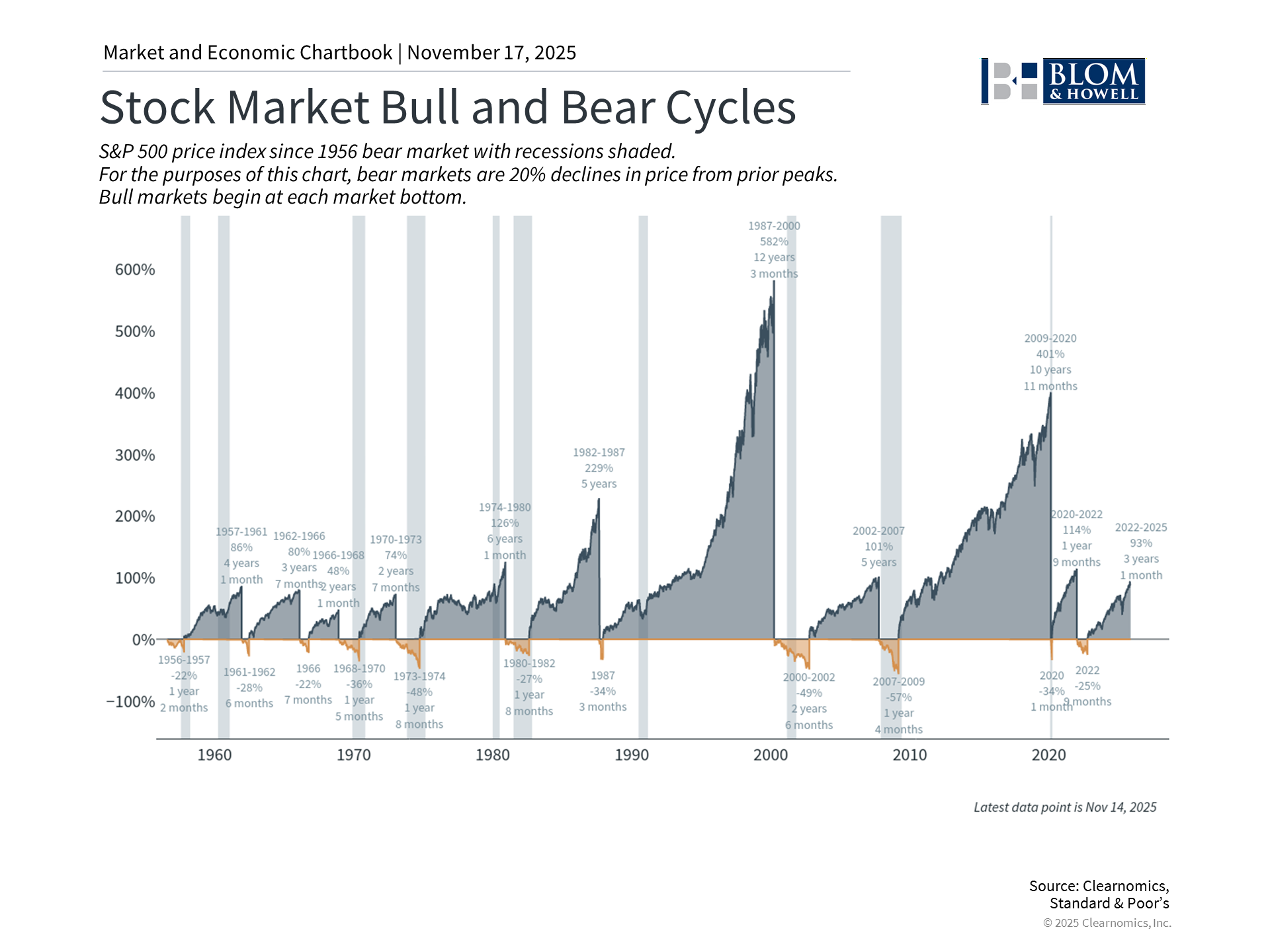 First, investors can be thankful that financial markets have performed well this year despite market swings. This bull market cycle, which began after the market bottom in October 2022, is now entering its fourth year. While past performance is no guarantee of future results, history shows that bull markets tend to last much longer than bear markets, often running for five to ten years or more. The typical bull market has delivered cumulative returns far exceeding what we've seen so far in this cycle, despite the many challenges investors faced during those times. While there are important concerns around valuations and market concentration, investing for the long term requires us to navigate all types of market conditions. The bond market's positive returns are important to highlight after the challenging interest rate and inflation environment of recent years. As rates have stabilized and the Federal Reserve has begun easing monetary policy again, bond prices have recovered. This demonstrates why holding both stocks and bonds remains important for portfolios in terms of both balance and income generation. This resilience underscores an important principle: trying to time markets around short-term events is not only difficult, but can be counterproductive if not considered as part of your broader financial plan. This was true even in April when markets fell close to bear market levels as new tariffs were announced. Markets not only rebounded quickly, but rose to new all-time highs. Investors who remained disciplined were rewarded, while those who reacted to headlines may have missed opportunities and, in some cases, may still be on the sidelines. Inflation has improved and the Fed is cutting rates