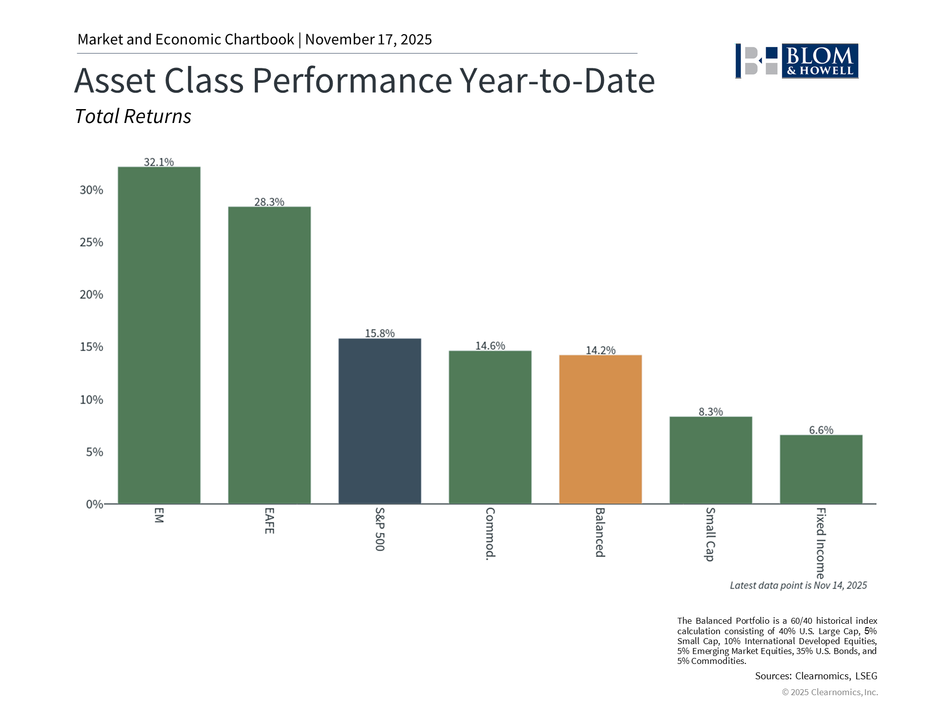 Second, investors can be grateful that inflation has improved, even if progress has been slower than many would prefer. Prices have risen about 3% over the past year, which continues to be a challenge for households and policymakers. However, from an investment standpoint, inflation has been much more stable, and there are fewer fears of runaway inflation compared to prior years. This has allowed the Fed to begin cutting interest rates after keeping them at restrictive levels for most of the year. This is also to support the job market, which has been weakening since the summer. Historically, lower rates benefit both stocks and bonds by reducing borrowing costs for businesses and consumers while making existing bonds with higher interest rates more valuable. So, even though inflation and interest rates will remain important factors for markets, fears of ever-rising inflation and interest rates appear to be behind us. Asset allocation helps manage risk while capturing opportunities